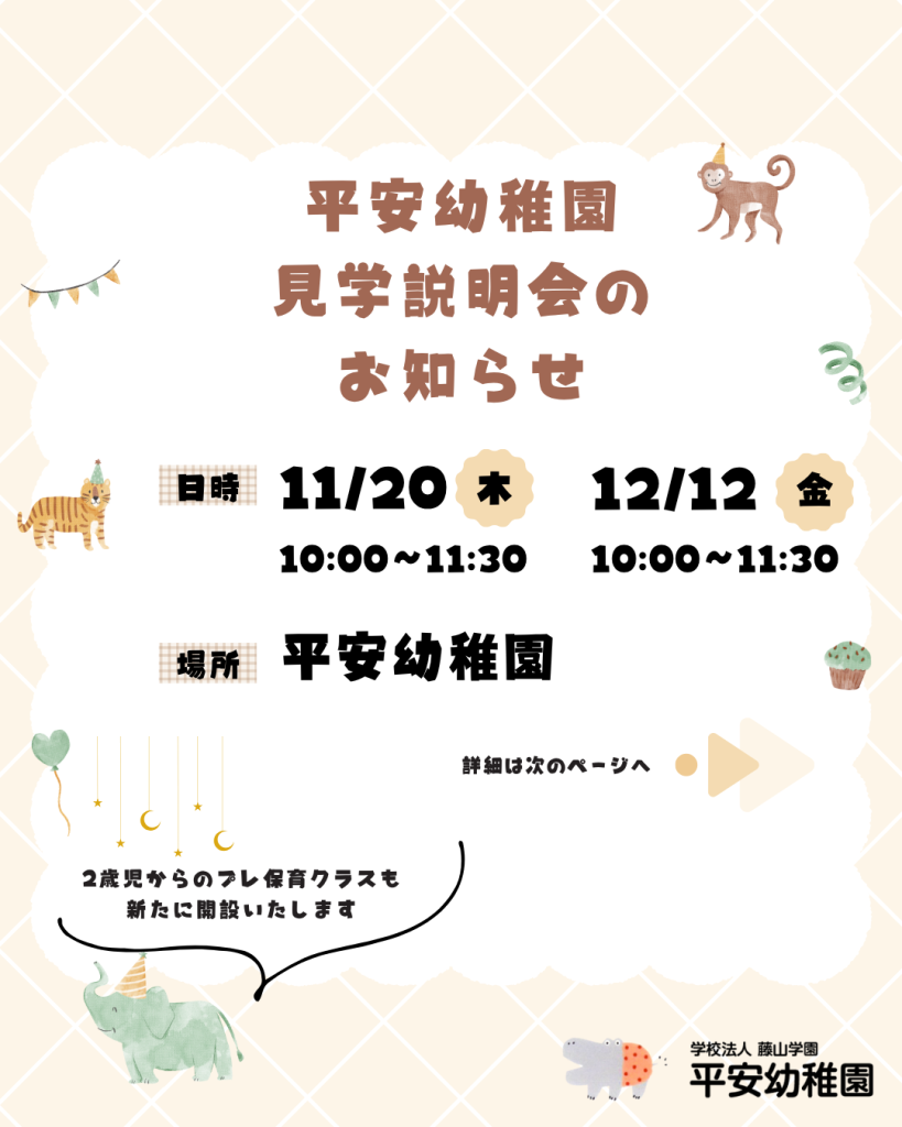 ぜひこの機会に、平安幼稚園の雰囲気や教育方針をご体感ください。