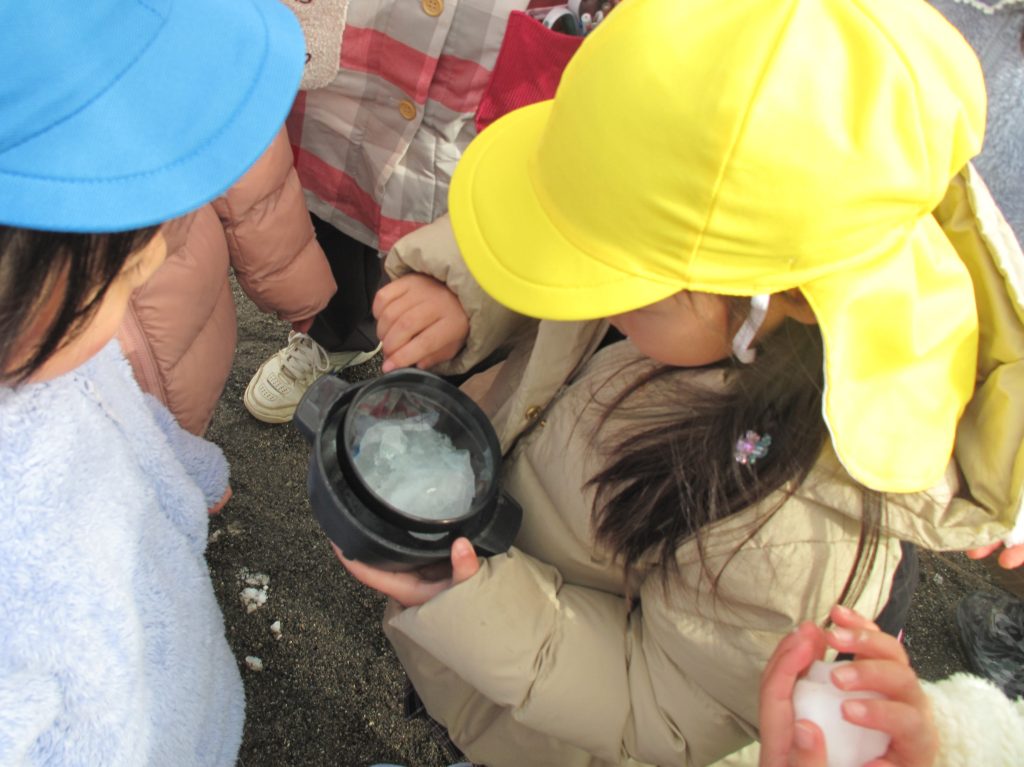 年長組は虫眼鏡で雪の結晶を見たり