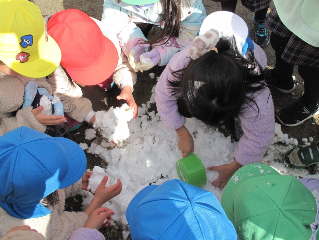 年中組と年長組は、先生達がかき集めてくれ雪や、花壇・遊具に積もった雪で