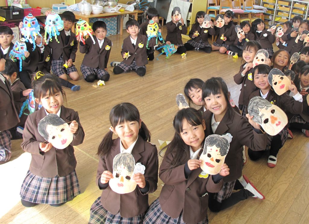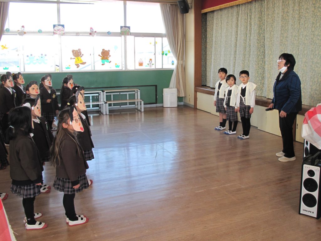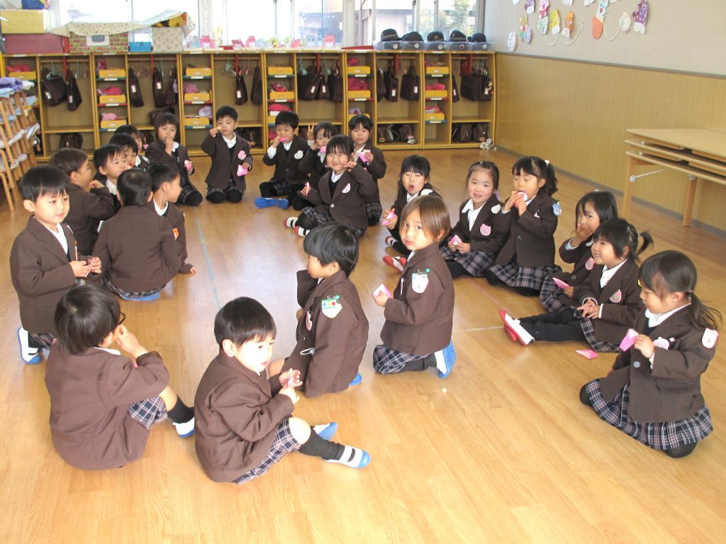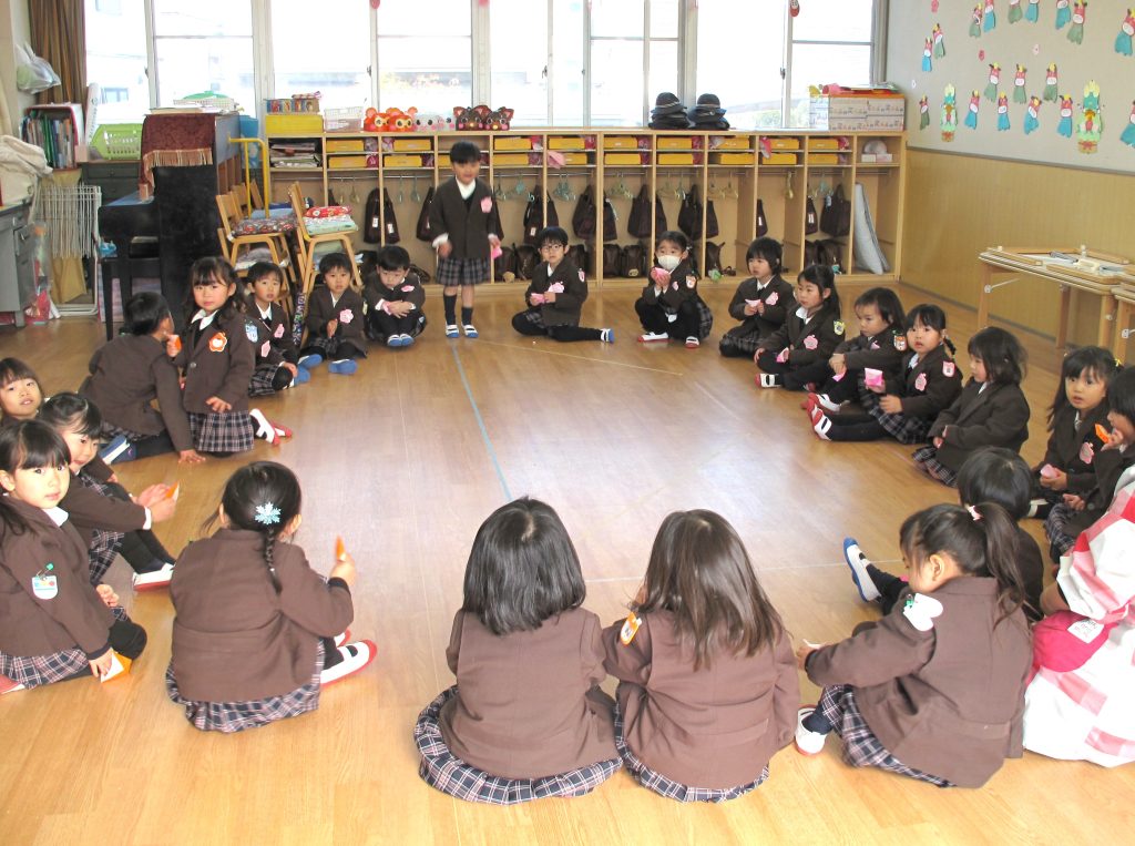 最初に講堂で『年男』と年中組・年長組のおふくさんが園長先生からお話を聞いて