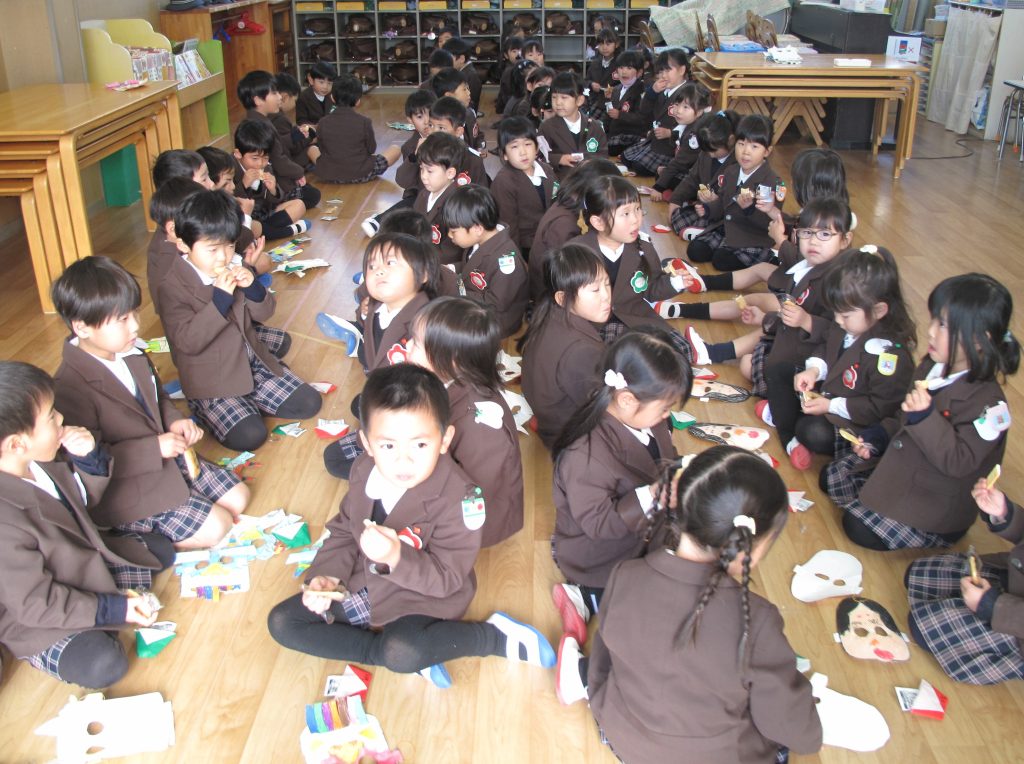 最初に講堂で『年男』と年中組・年長組のおふくさんが園長先生からお話を聞いて