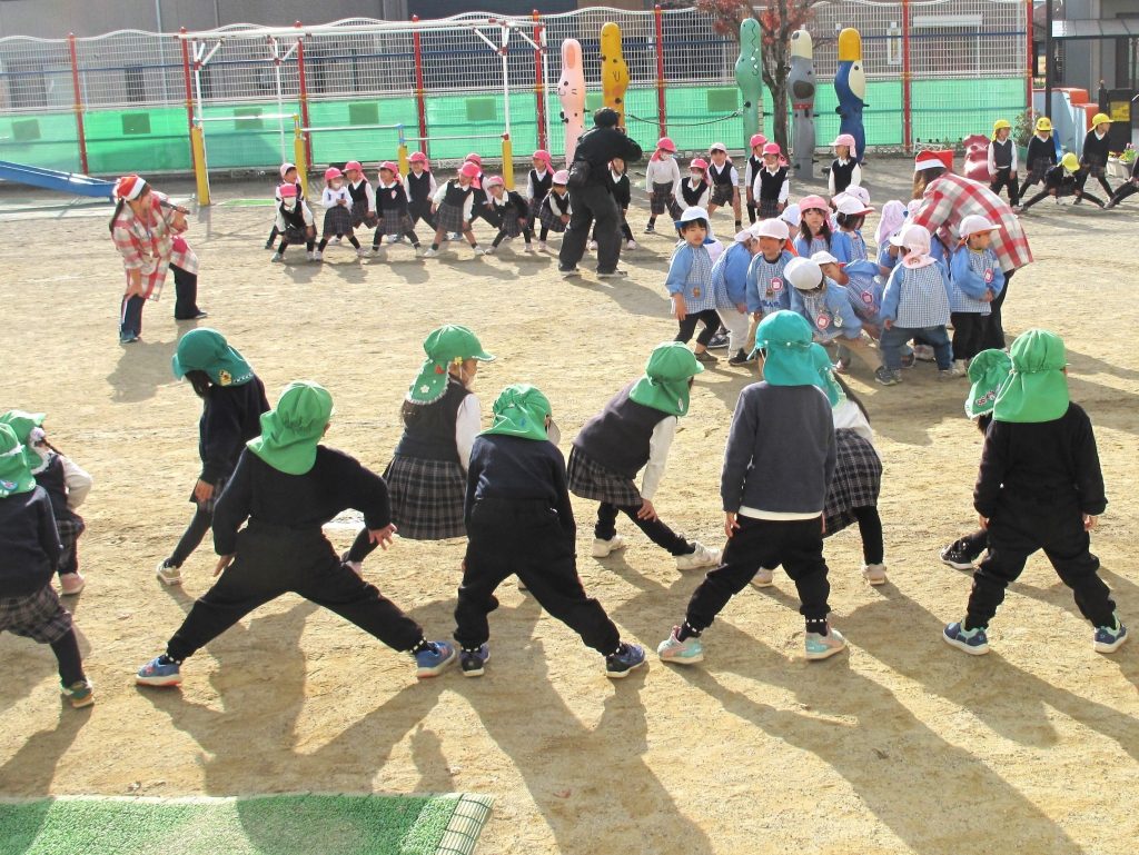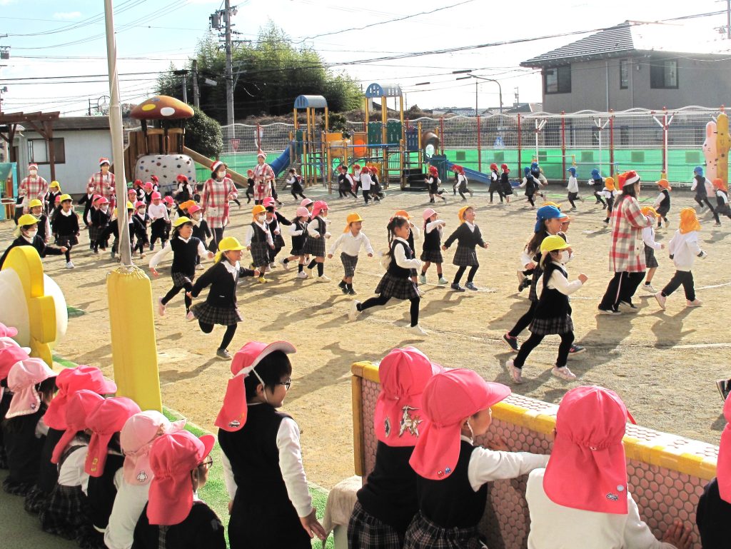 最初は園庭でマラソンをして身体を温めてから・・・