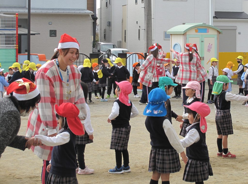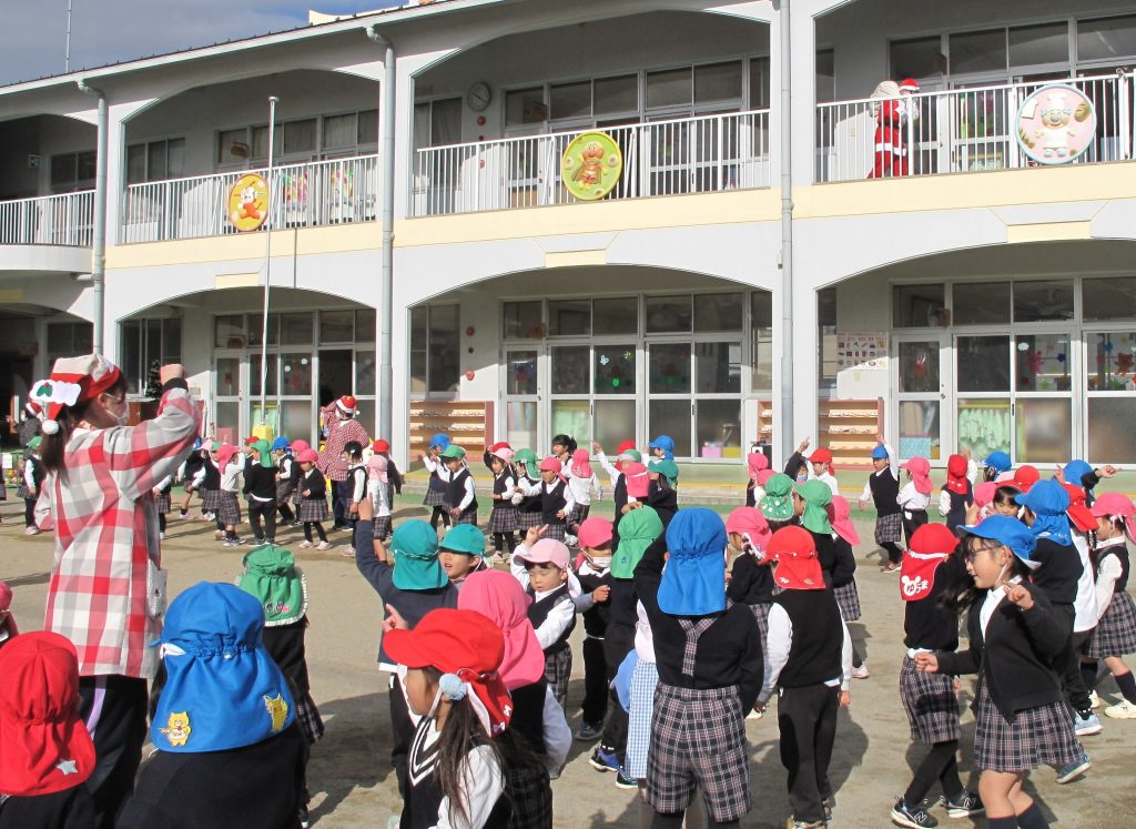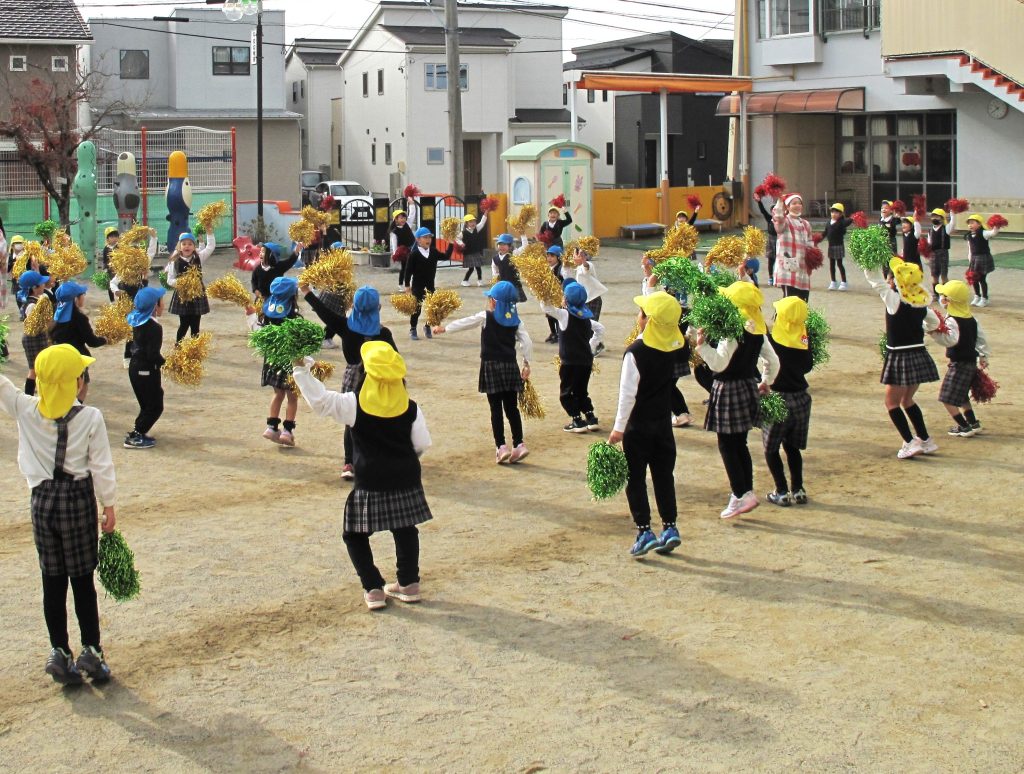 年長組さんは残ってクリスマスカラーのボンボンを持って踊ったり